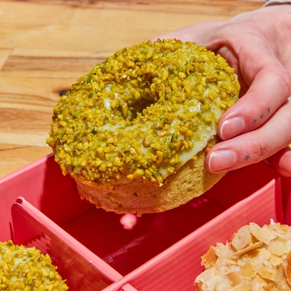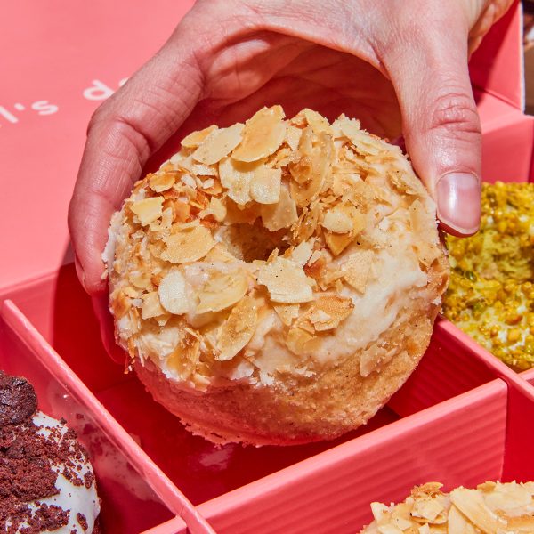 - 2x Vanille Mandel – ein weicher Vanille Cake Donut, dekoriert mit einer leichten Vanilleglasur und gerösteten Mandelblättchen.