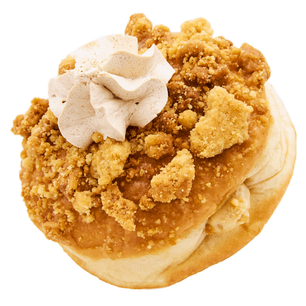 Für alle Karamell (und Lotus) Fans: Dieser Ring-Donut ist mit einer süßen Karamellglasur überzogen, in knusprige Lotus-Crumbles getaucht und mit Karamellsahne und einem Stück Lotus-Keks finalisiert. Cremig, crunchy, karamellig!