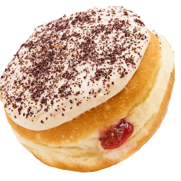 Unser Germknödel Donut ist zurück! Das klassische deutsche Dessert in Donut-Form! Gefüllt mit Pflaumenmus, getoppt mit Vanillecreme und Mohn.
